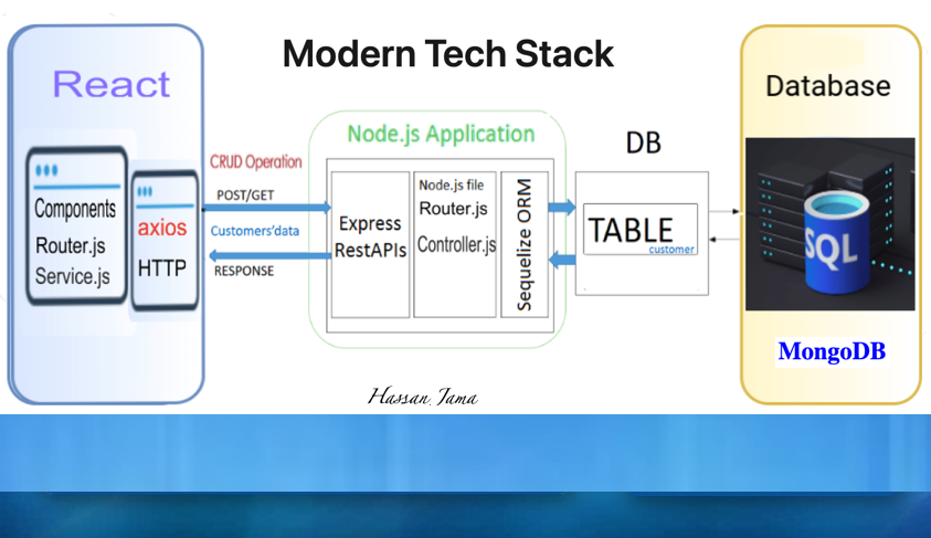 One of the most popular and easiest examples of a technology stack is the MERN stack. MERN stands for MongoDB-Express-React-Node.js. You can replace React and use Angular, as in the MEAN stack, since React is becoming equally popular, especially for single-page web applications.