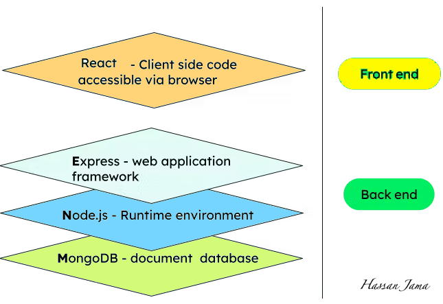 In the above diagram, Node.js is the runtime for the web applications, React provides the user interface, Express is a web framework built over Node.js, and MongoDB is the data platform or data stack that has the ability to transform data into a more usable form.